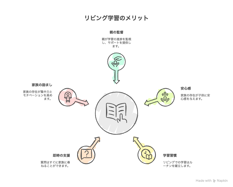 リビングで一緒に学ぶことで安心感が生まれ、勉強を楽しいと思えるようになります。