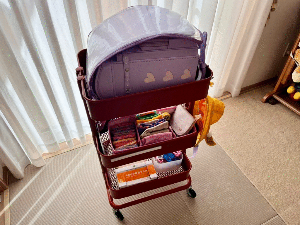 IKEAのワゴンにランドセル、帽子、名札、ヘアゴム、ハンカチ、ティッシュ、移動ポケットなど…毎日使うものをまとめてスッキリ!